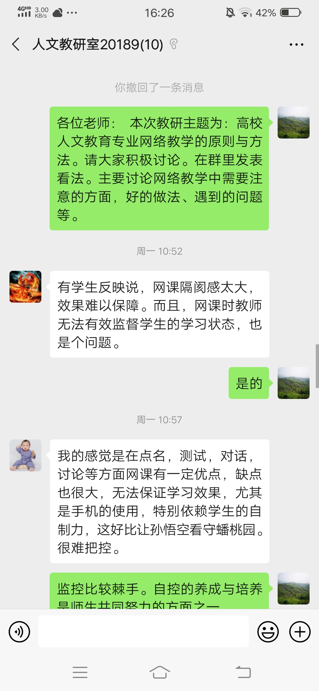 人文教育系通过微信群先后进行了三次主题教研活动,主题分别为:抗疫条件下高校人文教育专业教学的应对、高校教师网络教学的能力与培养、高校人文教育专业网络教学的原则与方法。