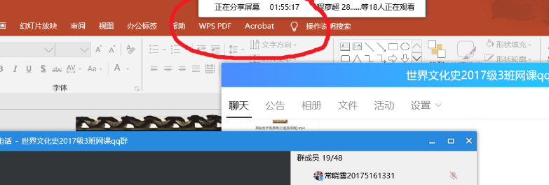 任命学委负责群的日常管理,在群里下达相应的学习任务、传递学习资料,使用QQ群屏幕分享功能,进行上课直播,在每次直播前,先进行系统的调试工作,第一次调试用时约30分钟,之后调试几乎1分钟内解决,十分顺畅。如下: