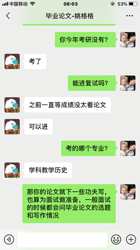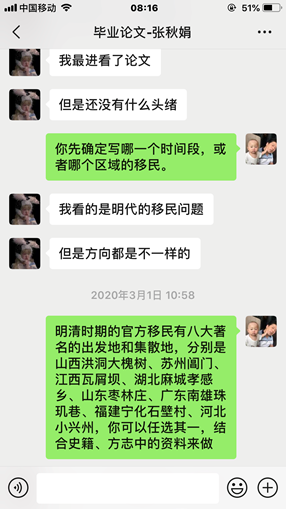 第三,升学、毕业刻不容缓。大四下半年是人生的岔路口。有的学生考了研,即将面临复试,此时正是需要老师指导和鼓励的时候,却不能和老师见面,焦虑的心情可想而知。王娟老师主动关心学生的考研情况,对学生复试和院校调剂给予中肯的建议,甚至有文学院的学生慕名而来。有的学生选择毕业即工作,但受疫情影响,今年的招聘,形势莫测,学生必然会情绪不稳定,王娟老师通过电话、微信等方式关注学生的情绪变化,尽自己所能给学生提供就业信息,并督促学生先完成毕业论文,了却后顾之忧,在疫情结束后就可以投入全部精力去找工作。