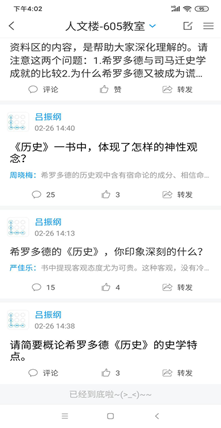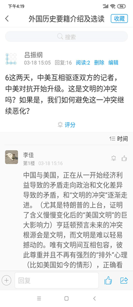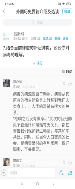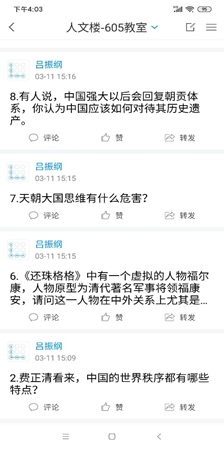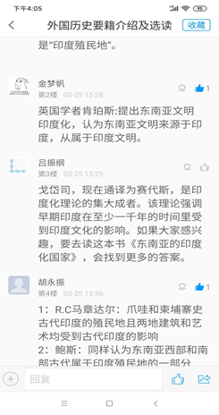 第三,加强互动,鼓励拓展式学习。每一次上课,吕老师都会在讨论区准备6至10个问题,这些问题涵盖所讲解内容的背景、主旨、观点及不足等各方面,鼓励学生积极进行回答。同时,他本人也积极参与其中,对相关的答案进行点评。为拓展学生的知识面,吕老师有意在相关问题下引入更多信息,启发学生思考,鼓励学生寻找相关领域的更多书籍寻找答案。每一节课的学习,都会让学生们体会到知识的整体性和拓展性,激发大家的自主学习意识,让人有满满的收获感。