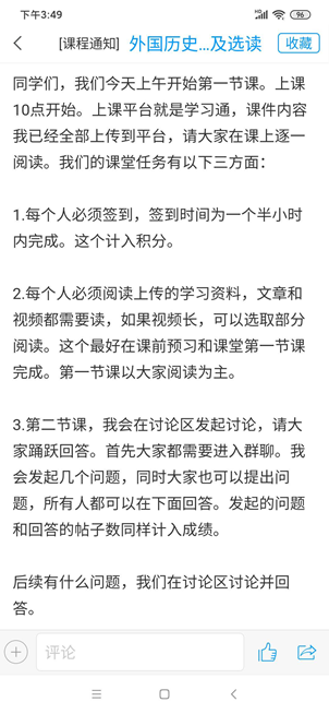 第一,建立网课授课规则,减少不确定因素。在第一节网课之前,吕老师就在学习通平台上向全体学生发邮件说明了网课规则,这些规则涉及到学校及学院的基本要求和他认为这门课应该做到的内容,比如学习成绩积分的计算、签到规则、课堂时间的分配、互动及讨论的原则等。从一开始就尽可能减少不确定因素,让同学们做到心里有数,这使得整个网课有了一个统一的形式。