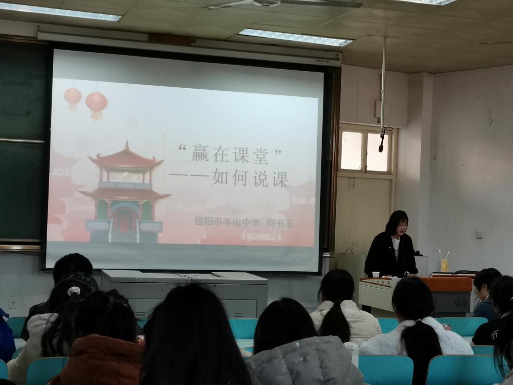 12月2日上午,应金年会官网邀请,信阳市羊山中学教师何书玉莅临金年会官网,为金年会官网师范生作题为《赢在课堂—如何说课》的教学讲座。讲座由金年会诚信信誉至上副院长孙炜主持,金年会官网2019级师范生和学科教学研究生到场聆听了此次讲座。