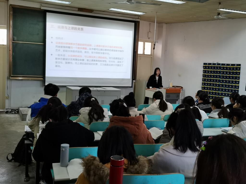 然后,何老师为同学们讲述说课的概念与意义、说课与上课的关系与不同,使同学们对说课有了更加清晰地认识与了解。在“如何说课”这一具体实践方面,从开头语、说教材、说学情、说教学目标、说重点难点、说教学方法、说教学过程、说板书设计、结束语等多个方面展开讲述。着重强调了要注意所讲知识点的正确性,要突出重难点,理清主次,充分安排利用时间,注重板书提示。此外,何老师提醒同学们在说课过程中要注意言行举止、规范站姿和手势。再结合具体案例,采用故事导入的方式为同学们带来了一次受益匪浅的讲座,对金年会官网师范生今后的学习与工作能力与素质的提升起到积极的促进作用。