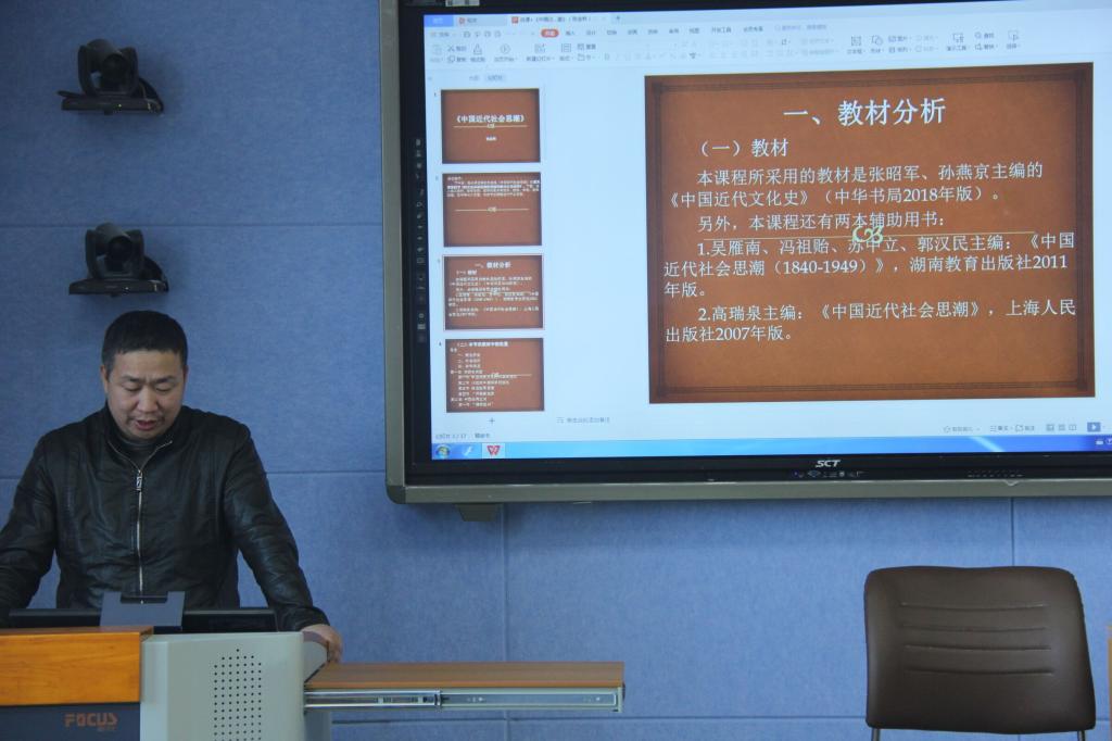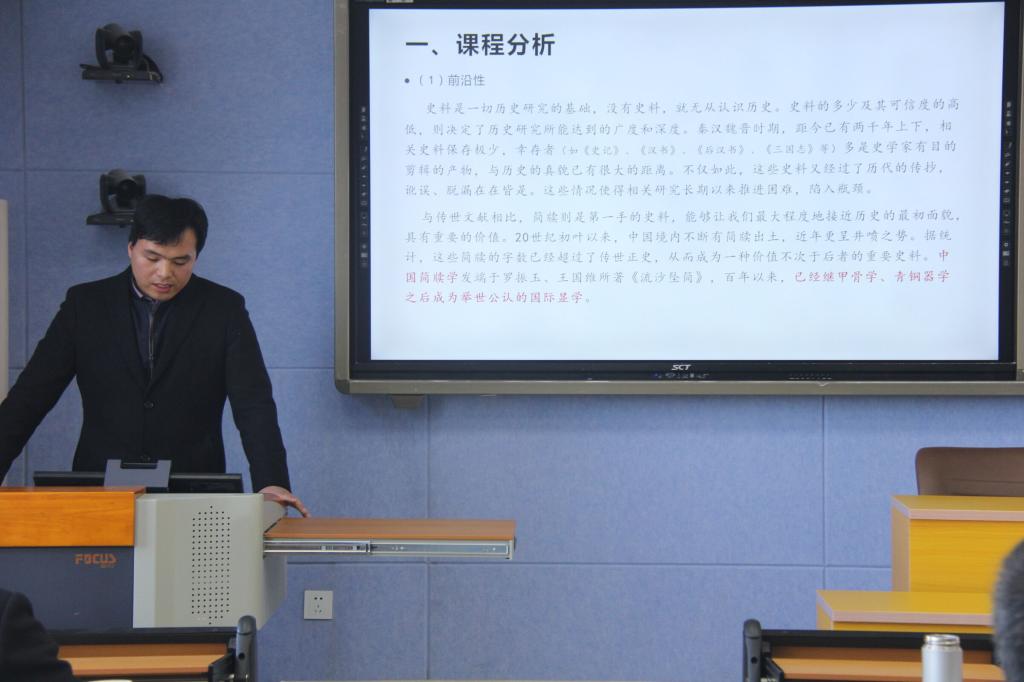 按照比赛规则及相关要求,张金林、邹维一、连先用、魏垚杰、李红等五位参赛教师依次进行说课。张金林老师主讲《中国近代社会思潮》,他从教学目标、重难点、教学方法、教学内容、课程板书等多个方面详细介绍了授课内容,注重利用新媒体进行授课;邹维一老师主讲《考古学概论》,她主要采用了线上线下,多方式开展本科教学,以信阳平桥区文物出土的视频为例,详尽直观地向大家展现了课程内容;连先用老师主讲《简牍学概论》,分析了简牍学的前沿性、现实性和草创性,并阐述了简牍学教学工作的主要心得;魏垚杰老师主讲《文化遗产保护理论与实践》,从理论到实践,详细介绍非物质文化遗产的保护与利用着手,课程内容生动形象,使人印象深刻。李红老师主讲《世界近代史》,以马克思主义的诞生为内容进行了教学示范,讲课内容逻辑清晰,见解独到,引人思考。