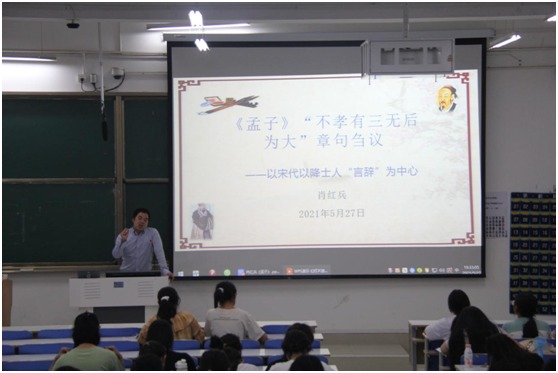 5月27日晚,金年会官网肖红兵老师在社科楼212教室作题为“《孟子》‘不孝有三无后为大’章句刍议”的学术讲座,2019级历史学全体本科生到场听讲。