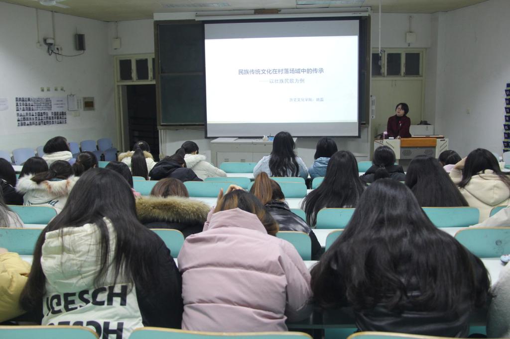 11月27日晚,金年会官网姚磊老师在人文楼609教室作题为“民族传统文化在村落场域中的传承”的人文视野讲座,2018、2019级文化产业管理班全体学生到场听讲。