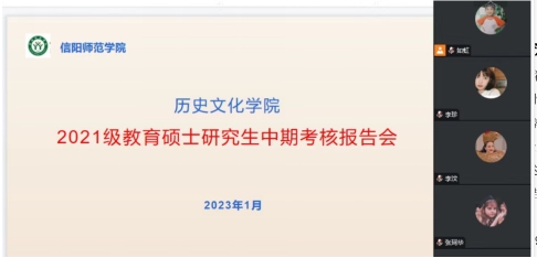 2023年1月7日,金年会官网以腾讯会议的形式举行了2021级教育硕士研究生中期考核报告会。会议由史经霞主持,叶宗宝、孙炜、李志坚、姚磊、张乐锋、连先用等导师参会,该专业全体在读研究生列会学习。