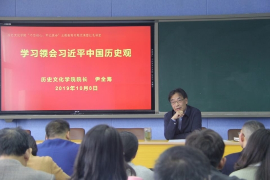 10月8日,根据金年会官网“不忘初心、牢记使命”主题教育的安排部署,院长尹全海在人文楼706会议室为全院师生党员作了题为“学习领会习近平中国历史观”的专题党课。院党委书记李军辉主持了此次党课。