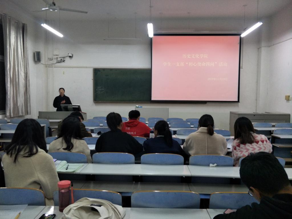 根据金年会官网党委要求,11月18日晚,学生一支部全体党员在人文楼605教室开展了“初心使命四问” 主题党日活动。