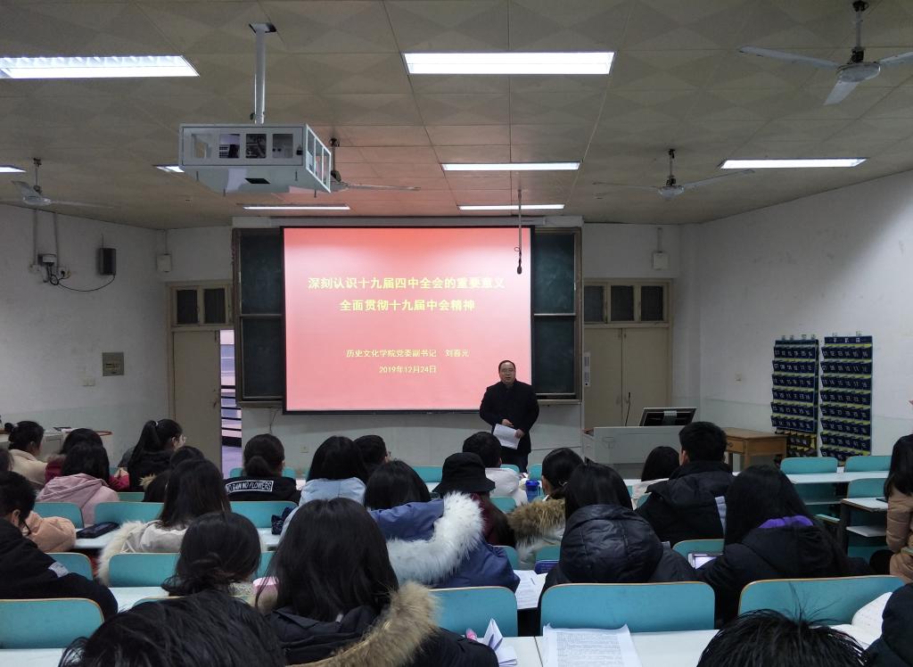 根据学院统一安排,12月24日下午,党委副书记刘喜元在人文楼509教室为全院学生党员作了题为“深刻认识十九届四中全会的重要意义,全面贯彻十九届中会精神”的专题党课。