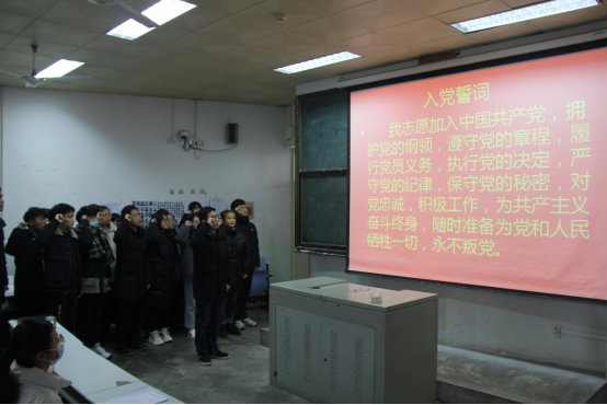 会议伊始,全体起立唱《国际歌》。接着,由付亚男宣读参加宣誓的转正党员与预备党员名单,参加宣誓的预备党员在领誓人邓皓的带领下,面向党旗庄严宣誓。转正党员代表韩广州、预备党员代表王晨晨、入党积极分子代表龚丽文先后发言。