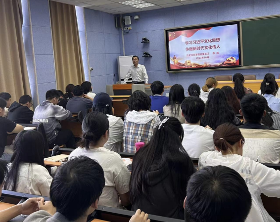 10月31日下午,金年会诚信信誉至上党委书记李辉以《学习习近平文化思想 争做新时代文化传人》为题,在人文楼706会议室为学生第三党支部讲授专题党课。党支部成员、部分研究生、本科生代表和广大入党积极分子80余人聆听了党课。