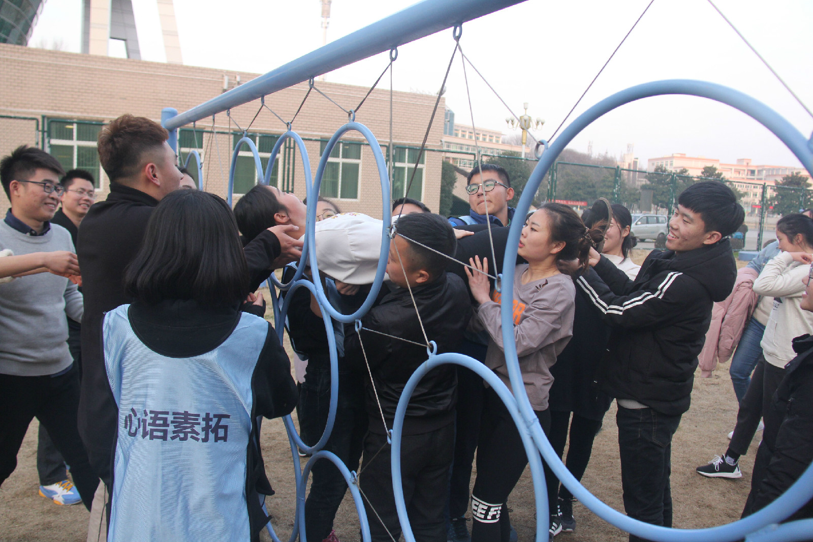 在专业老师的指导下,所以学生分成三队,分别进行了高空断桥活动和模拟电网活动。首先是高空断桥活动,由学生站在高空的踏板上,眼睛注视前方,完成起步、跨越、落地等动作。这一活动有利于锻炼和培养学生勇于挑战和突破自我的能力和精神。接着是模拟电网活动,这一活动旨在培养学生们的团队协作能力以及团队内部的良好工作作风。在活动中,每名学员只能钻一个电网,不得重复,不得触及电网,不得发出声音,并寻求过电网的最佳方法。最后,同学们还在青年广场一起玩了割绳子等群体游戏。