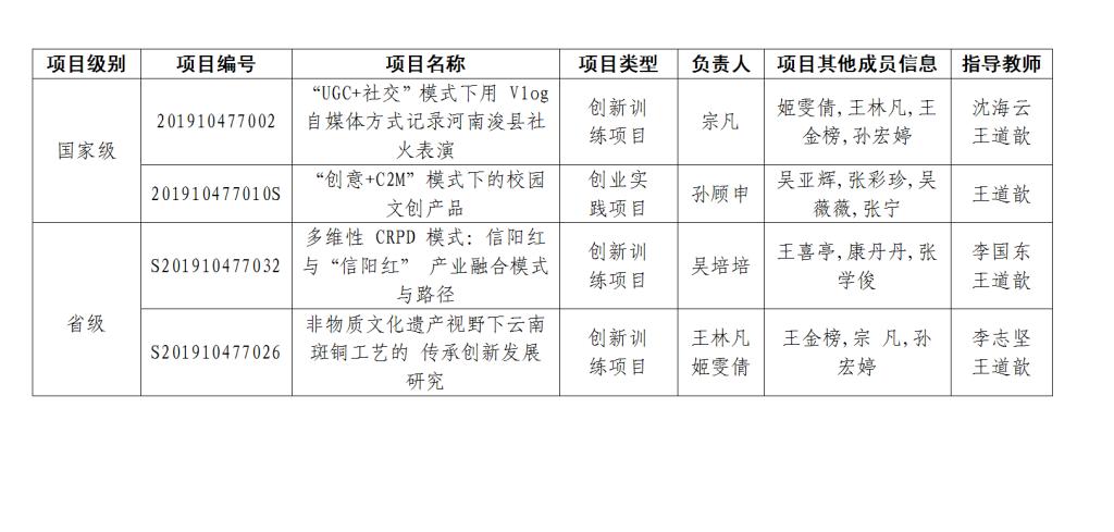 金年会官网获批两项分别为李国东、王道歆老师指导,吴培培、王喜亭、康丹丹、张学俊为项目组成员的《多维性CRPD模式:信阳红与“信阳红”产业融合模式与路径》;由李志坚、王道歆老师指导,王林凡、姬雯倩、王金榜、宗凡、孙宏婷为项目组成员的《非物质文化遗产视野下云南斑铜工艺的传承创新发展研究》。