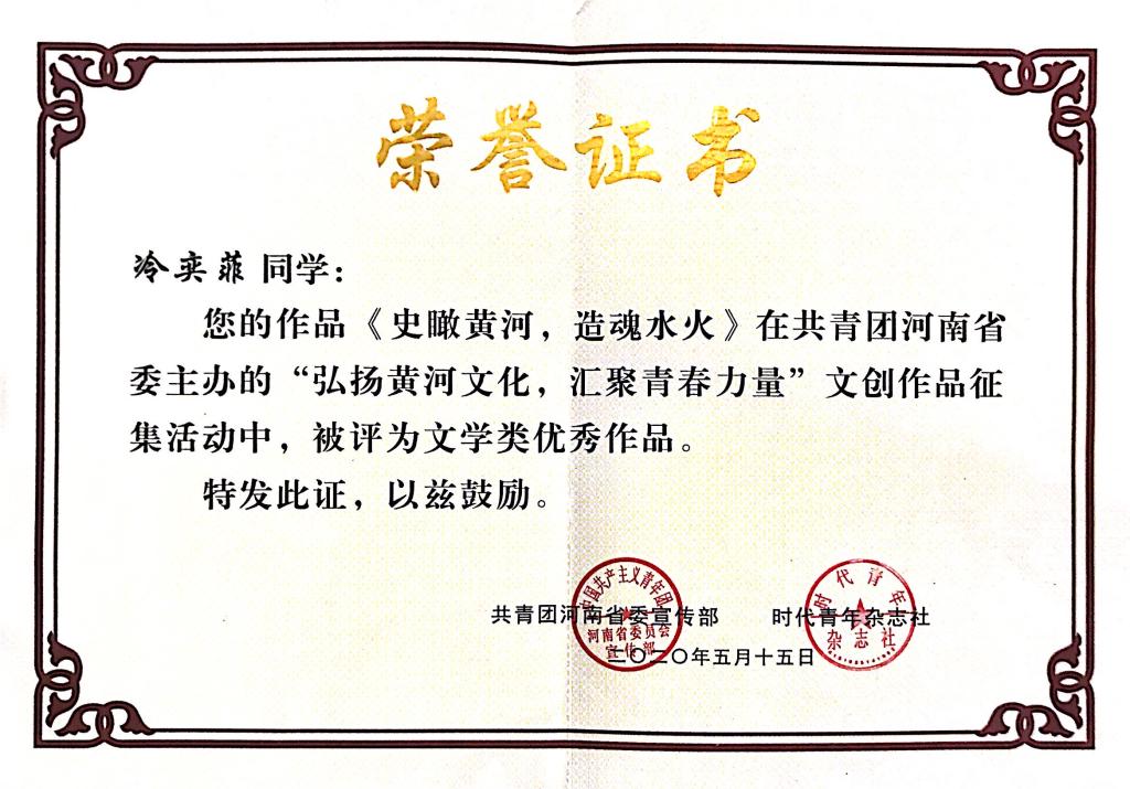 近日,由共青团河南省委主办,由共青团河南省委宣传部、时代青年杂志社、河南省青少年全媒体中心承办的“弘扬黄河文化,汇聚青春力量”文艺作品征集活动落下帷幕。金年会官网2018级历史学1班学生冷奕菲作品《史瞰黄河,造魂水火》被评为文学类优秀作品。