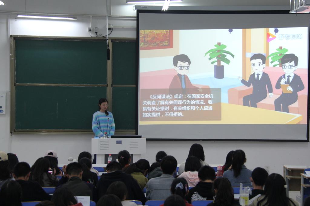 付亚男首先带领大家认真学习《中华人民共和国反间谍法》,明晰公民和组织在国家反间谍工作中的权利和义务。随后通过短片,使同学们更加了解如何界定间谍行为、间谍罪刑事责任以及如何举报处理间谍行为等方面的问题。最后,付亚男介绍典型案例告诫大家,其实危害国家安全的行为离我们并不遥远,我们一个小小的行为都会给国家带来很大的危害。