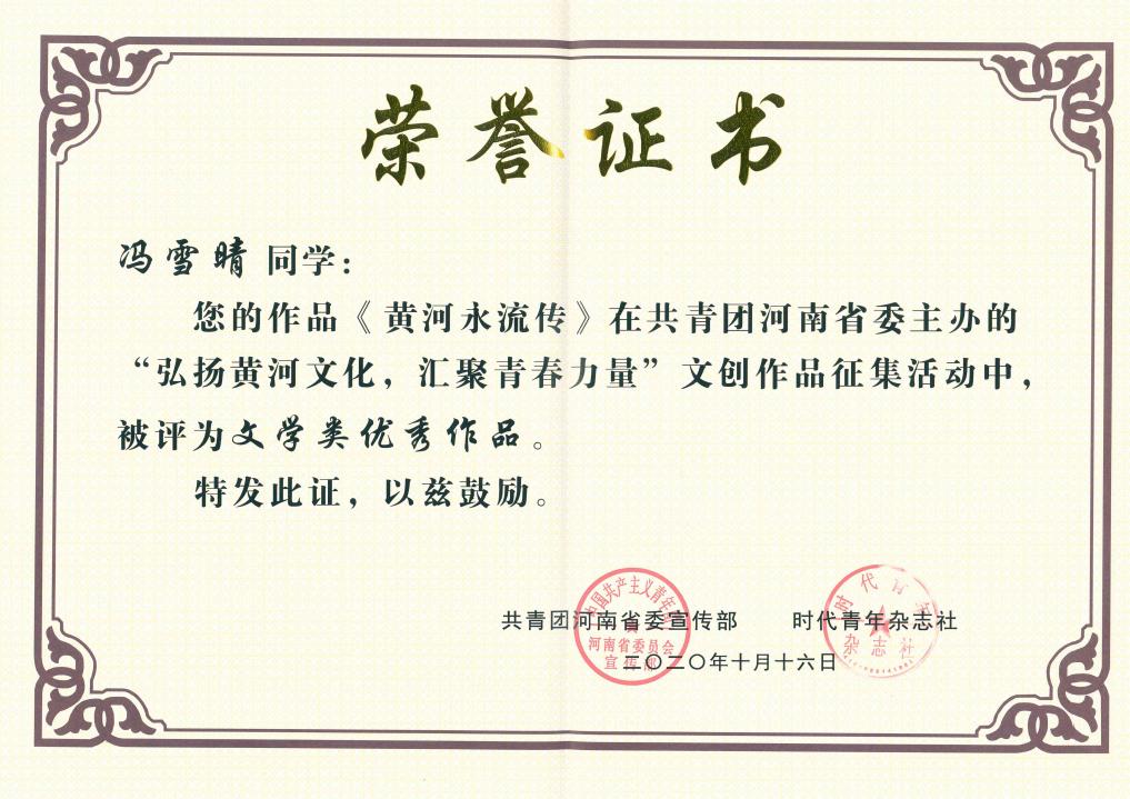 近日,由共青团河南省委主办,由共青团河南省委宣传部、时代青年杂志社、河南省青少年全媒体中心承办的“弘扬黄河文化,汇聚青春力量”文艺作品征集活动落下帷幕。金年会官网2019级历史学2班学生冯雪晴作品《黄河永流传》被评为文学类优秀作品。