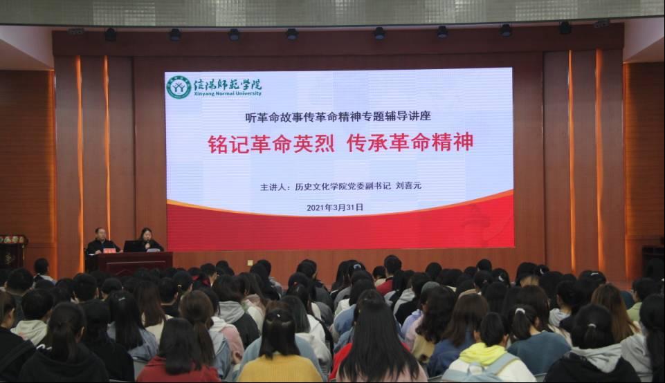 刘喜元以“纵使不成头被砍,也叫人间称好汉”的信阳四望山的拓荒者王伯鲁烈士的革命事迹为引,生动讲述了“斩尽妖魔济众生”的詹谷堂烈士、“破家革命,赤胆忠心”的吴焕先烈士及其家人、“满门忠烈炳千秋”的戴克敏及其家族、“红旗卷起农奴戟”的徐海东大将家族、“为有牺牲多壮志”的毛泽东亲属及“你们的姓名无人知晓,你们的功勋永世长存”的红三十四师众多无名烈士的革命故事,向在场学生传递了英雄们在革命中献身自我、不畏艰险、一心向党的革命精神。同时刘喜元还结合脱贫攻坚路上、对抗新冠肺炎疫情、维护祖国边界安全中以身殉国的动人故事,殷切希望同学们向革命先烈学习,树立远大理想,担当时代重任,为实现中华民族伟大复兴的中国梦作出贡献。