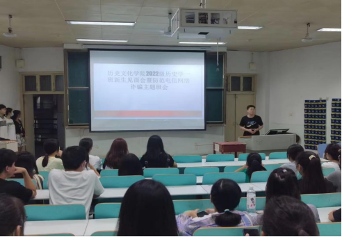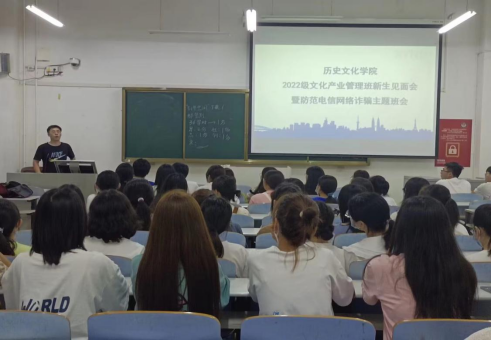 2022年9月18日晚,金年会官网2022级新生见面会暨防范电信网络诈骗主题班会在人文楼举行。本次活动由2022级历史学及文化产业管理专业五个新生班同步举行。各班班主任分别主持会议。