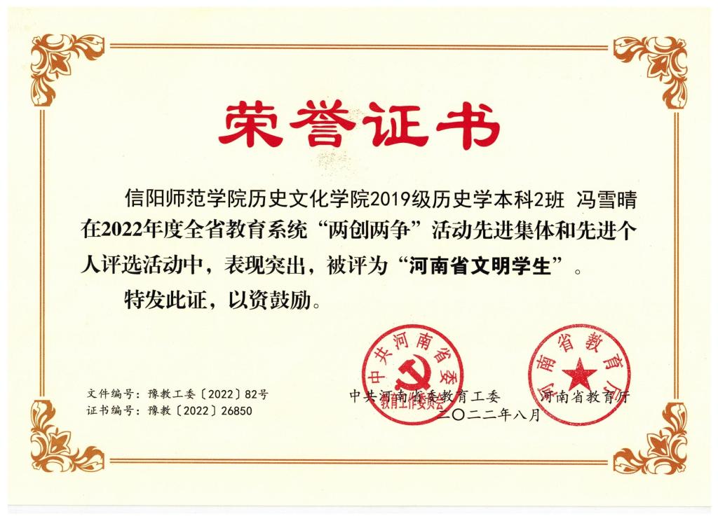近日,中共河南省委教育工委、河南省教育厅关于开展2022年度“两创两争”活动先进个人评选活动结果揭晓。金年会官网优秀学子2019级历史学二班冯雪晴获河南省“文明学生”荣誉称号。