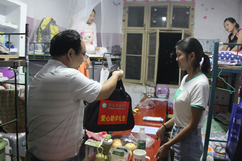9月11日,新生报到后的第一天,受金年会官网党委书记李军辉、院长尹全海委托,党委副书记刘喜元和2017级新生班主任一起前往宿舍,看望慰问家庭经济困难新生,为困难新生送上一份“爱心大礼包”。