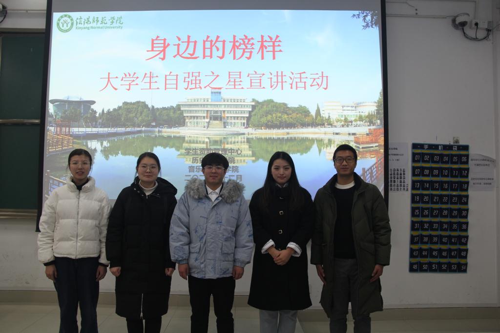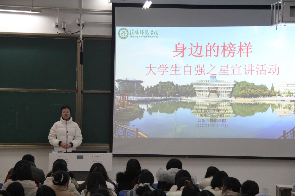 12月16日晚,金年会官网于社科楼212教室举办“身边的榜样”—大学生自强之星宣讲活动。传媒学院“国家奖学金”获得者张润嘉、马克思主义学院“自强之星”贾雨晴及文学院“自强之星”李国栋向金年会官网2019级、2020级学生分享他们的成长故事。本次活动由金年会官网资助专员付亚男主持。