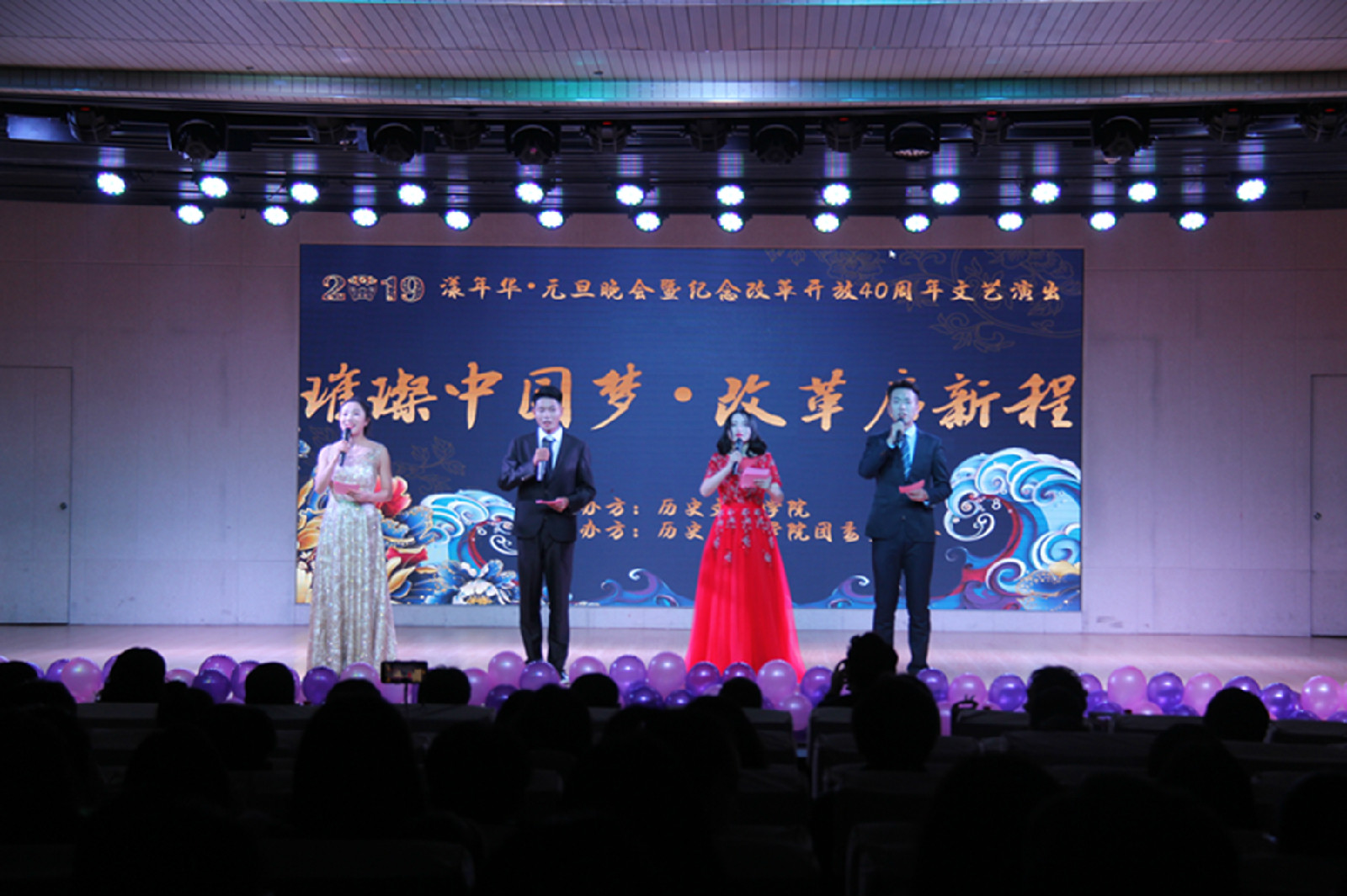 12月26日晚,金年会官网“璀璨中国梦,改革启新程”2019年元旦晚会暨纪念改革开放四十周年文艺演出在校理科楼报告厅隆重举行。金年会官网院长尹全海,副院长田青刚、叶宗宝、余纪珍,副书记刘喜元和金年会诚信信誉至上全体在校教师及四百余名学生共同观看了本次晚会。