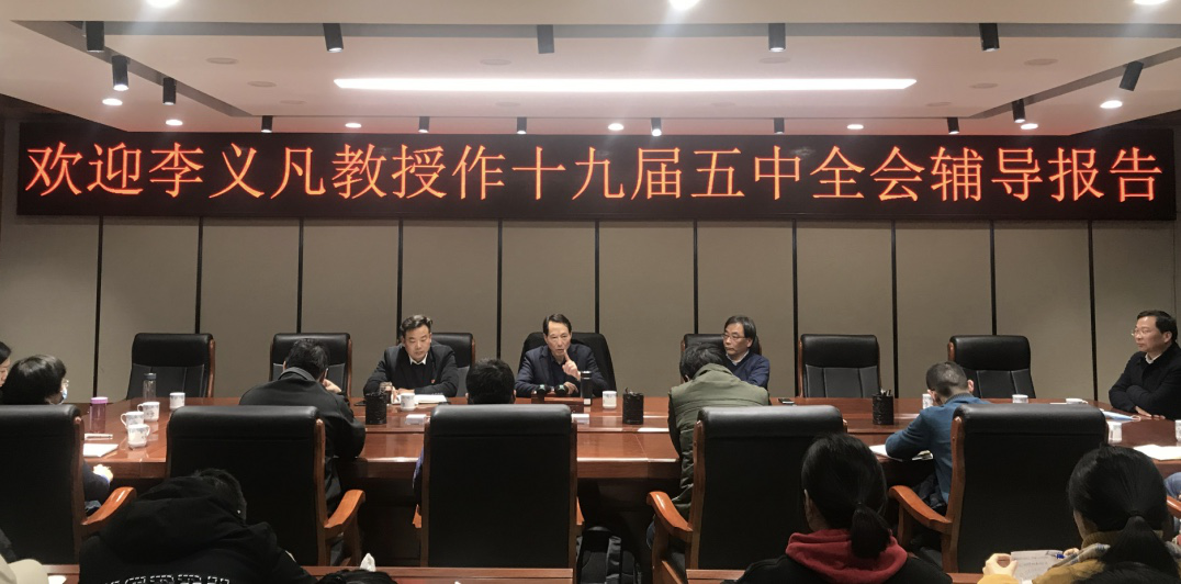 为深入学习贯彻党的十九届五中全会精神,11月26日下午,应金年会官网邀请,原周口师范学院校长李义凡教授逸夫楼321会议室为金年会官网师生作辅导报告。辅导报告由金年会官网党委书记李军辉主持。