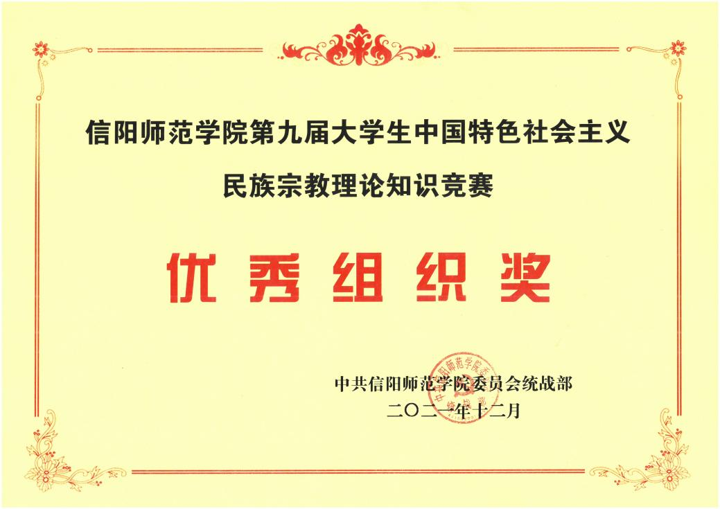 根据信阳师范学院党委统战部统一部署要求,金年会诚信信誉至上党委认真组织学生积极参加第九届大学生中国特色社会主义民族宗教理论知识竞赛线上答题活动,金年会官网学生在比赛中成绩优异,高小力同学获省级参与奖,程心如等16名同学获校级参与奖,学院荣获优秀组织奖。