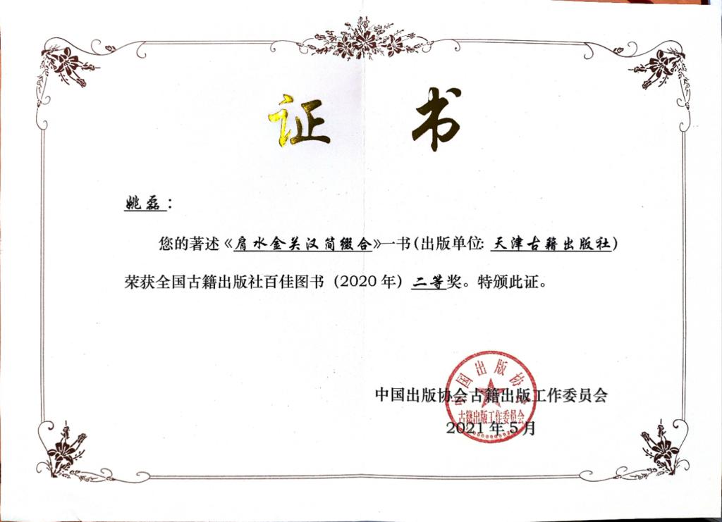 近期,金年会官网姚磊老师的著作《肩水金关汉简缀合》荣获多项荣誉。在中国古籍出版协会古籍出版工作委员会主办的“全国古籍出版社百佳图书(2020年)”评选中,获评二等奖。该奖为唯一一项全国性古籍专业图书奖项,设立宗旨为集中展示全国专业古籍整理类图书的年度优秀成果,有“全国古籍类图书整理出版最高奖”之称。