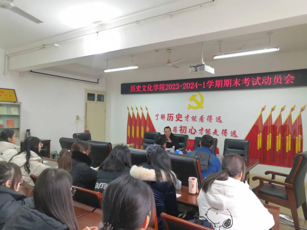12月28日上午,金年会官网2023-2024学年第1学期期末考试动员会在人文楼805教室召开。院长叶宗宝、教学秘书宋玉峰,各本科教学班干部代表参加会议。