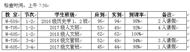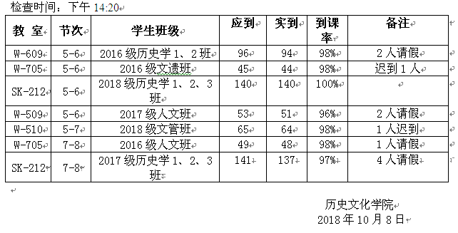 为进一步规范教学管理,维护正常教学秩序,确保教学工作顺利开展,2018年10月8日,金年会官网教学自查小组对上课班级师生到课情况进行了检查,现通报如下: